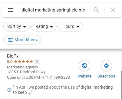 Beyond your web pages, keywords have value for online listings. See here how Google has shown in bold the keyword that matches with our search, emphasizing the relevance of our listing to the search “digital marketing springfield mo.”