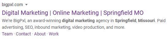 Here you can see that the title tag “Digital Marketing | Online Marketing | Springfield MO” contains valuable keywords for searches commonly made by people seeking marketing services in the Springfield area. Google has also displayed in bold the keywords most relevant to the search query (in this case, “digital marketing springfield mo”).